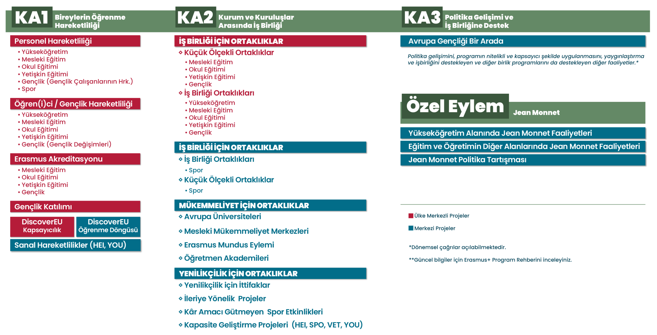 Erasmus+ Programı kapsamında desteklenen faaliyetler temel olarak 3 Ana Eylem (Key Action, KA) ve 1 Özel Eylem altında toplanmaktadır.